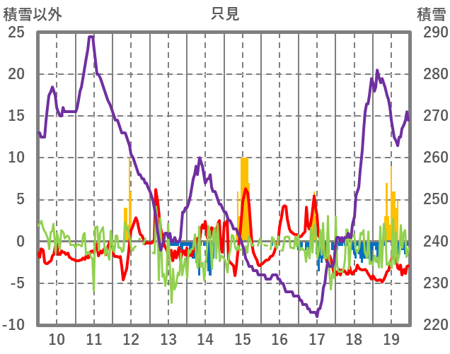 | 日 | 時 | 気温 | 降水 | 風向/風速 | 日照 | 積雪 | 降雪 |
