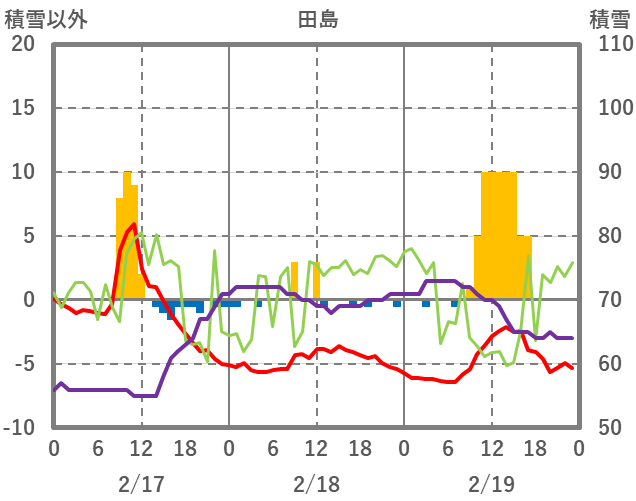| 日 | 時 | 気温 | 降水 | 風向/風速 | 日照 | 積雪 | 降雪 |