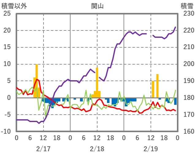 | 日 | 時 | 気温 | 降水 | 風向/風速 | 日照 | 積雪 | 降雪 |