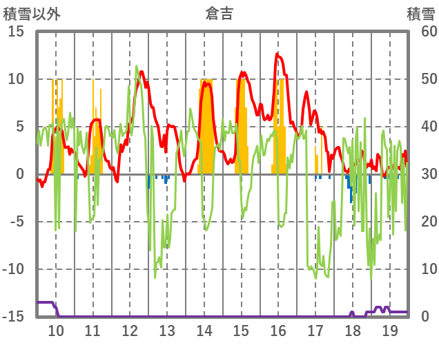 | 日 | 時 | 気温 | 降水 | 風向/風速 | 日照 | 積雪 | 降雪 |