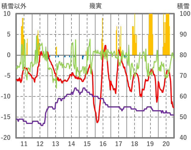 | 日 | 時 | 気温 | 降水 | 風向/風速 | 日照 | 積雪 | 降雪 |