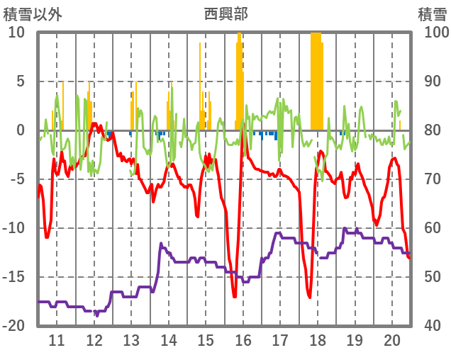 | 日 | 時 | 気温 | 降水 | 風向/風速 | 日照 | 積雪 | 降雪 |