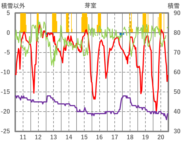 | 日 | 時 | 気温 | 降水 | 風向/風速 | 日照 | 積雪 | 降雪 |