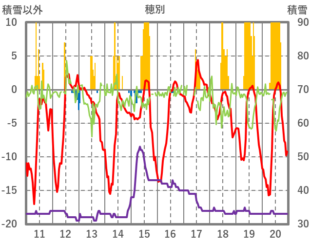 | 日 | 時 | 気温 | 降水 | 風向/風速 | 日照 | 積雪 | 降雪 |
