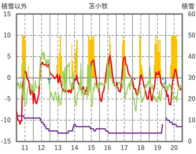 | 日 | 時 | 気温 | 降水 | 風向/風速 | 日照 | 積雪 | 降雪 |