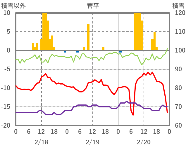 | 日 | 時 | 気温 | 降水 | 風向/風速 | 日照 | 積雪 | 降雪 |