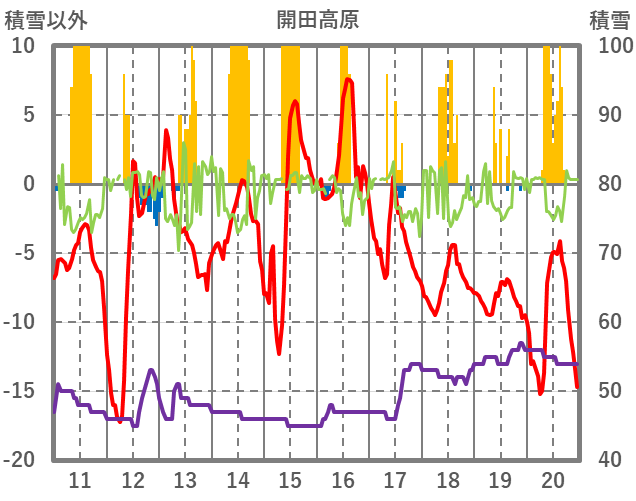 | 日 | 時 | 気温 | 降水 | 風向/風速 | 日照 | 積雪 | 降雪 |