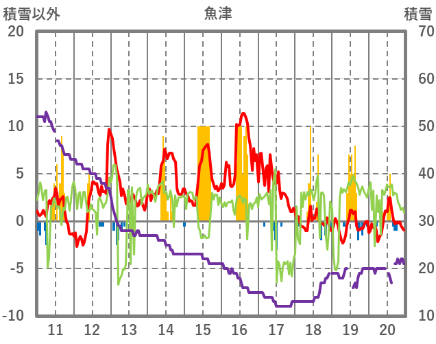 | 日 | 時 | 気温 | 降水 | 風向/風速 | 日照 | 積雪 | 降雪 |