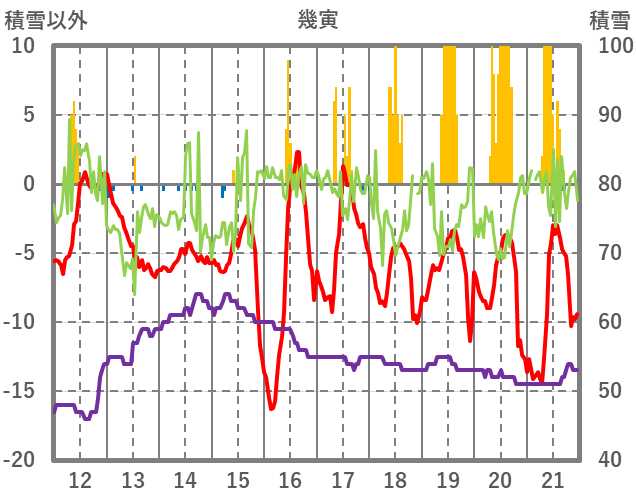 | 日 | 時 | 気温 | 降水 | 風向/風速 | 日照 | 積雪 | 降雪 |