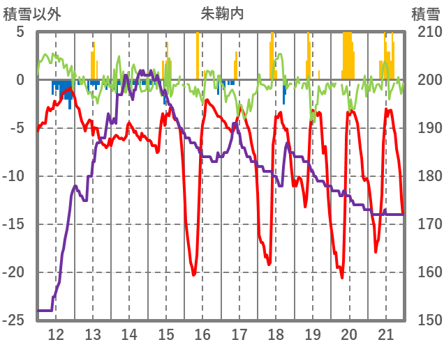| 日 | 時 | 気温 | 降水 | 風向/風速 | 日照 | 積雪 | 降雪 |