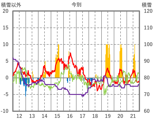 | 日 | 時 | 気温 | 降水 | 風向/風速 | 日照 | 積雪 | 降雪 |
