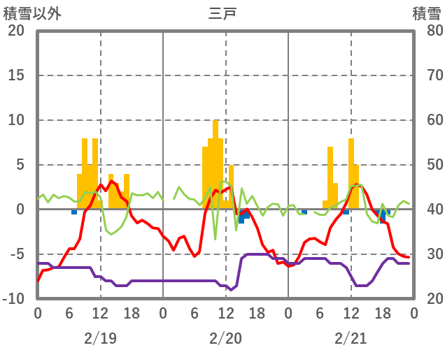| 日 | 時 | 気温 | 降水 | 風向/風速 | 日照 | 積雪 | 降雪 |