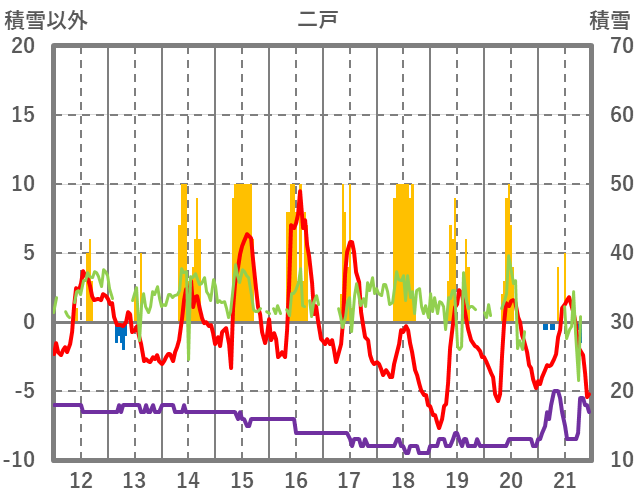 | 日 | 時 | 気温 | 降水 | 風向/風速 | 日照 | 積雪 | 降雪 |