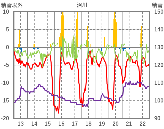 | 日 | 時 | 気温 | 降水 | 風向/風速 | 日照 | 積雪 | 降雪 |