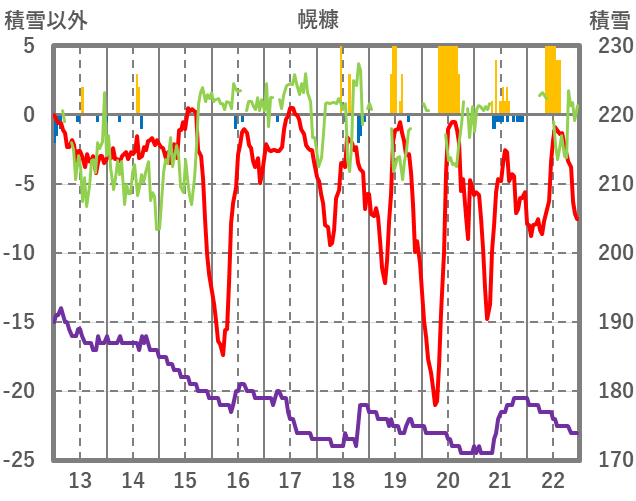 | 日 | 時 | 気温 | 降水 | 風向/風速 | 日照 | 積雪 | 降雪 |