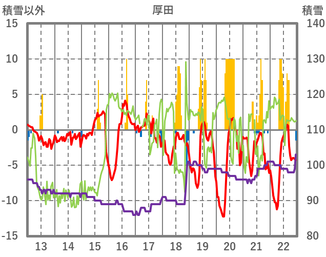 | 日 | 時 | 気温 | 降水 | 風向/風速 | 日照 | 積雪 | 降雪 |