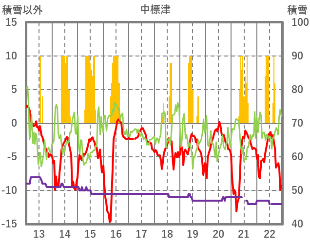 | 日 | 時 | 気温 | 降水 | 風向/風速 | 日照 | 積雪 | 降雪 |