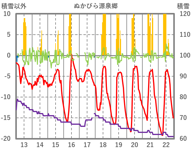 | 日 | 時 | 気温 | 降水 | 風向/風速 | 日照 | 積雪 | 降雪 |