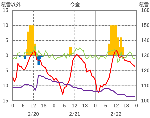 | 日 | 時 | 気温 | 降水 | 風向/風速 | 日照 | 積雪 | 降雪 |