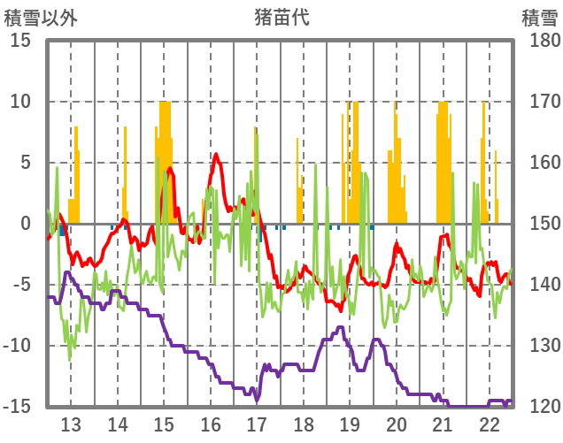 | 日 | 時 | 気温 | 降水 | 風向/風速 | 日照 | 積雪 | 降雪 |