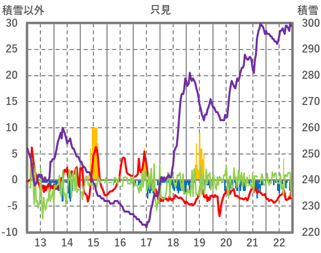 | 日 | 時 | 気温 | 降水 | 風向/風速 | 日照 | 積雪 | 降雪 |