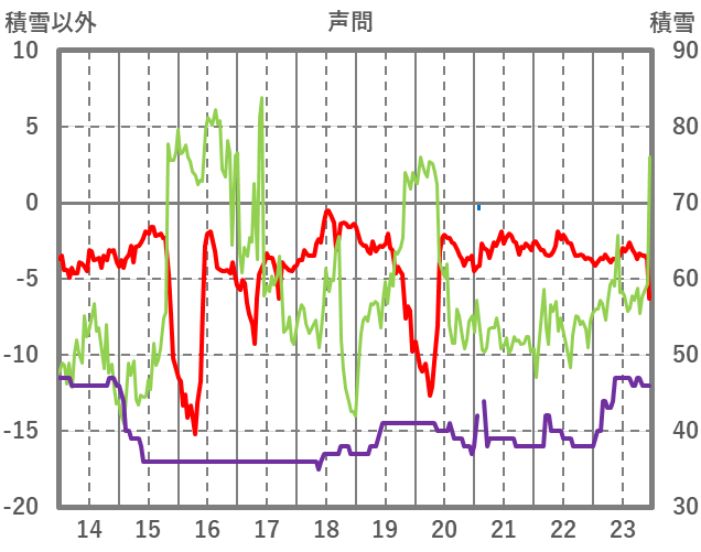| 日 | 時 | 気温 | 降水 | 風向/風速 | 日照 | 積雪 | 降雪 |