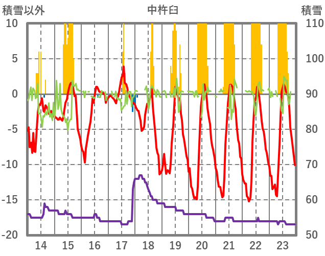 | 日 | 時 | 気温 | 降水 | 風向/風速 | 日照 | 積雪 | 降雪 |