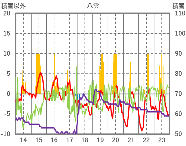 | 日 | 時 | 気温 | 降水 | 風向/風速 | 日照 | 積雪 | 降雪 |