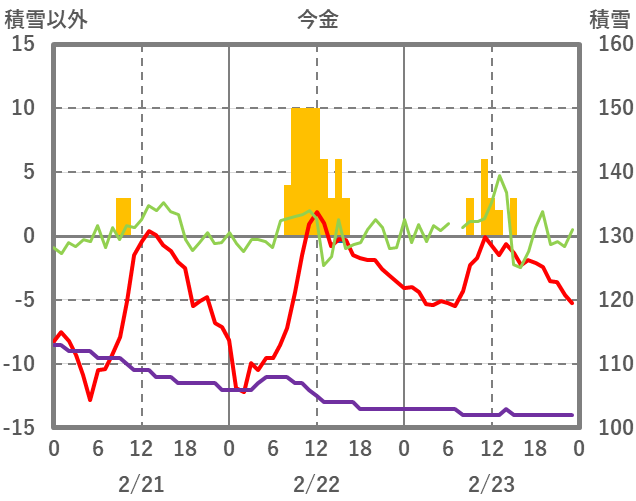 | 日 | 時 | 気温 | 降水 | 風向/風速 | 日照 | 積雪 | 降雪 |