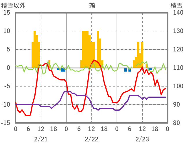 | 日 | 時 | 気温 | 降水 | 風向/風速 | 日照 | 積雪 | 降雪 |