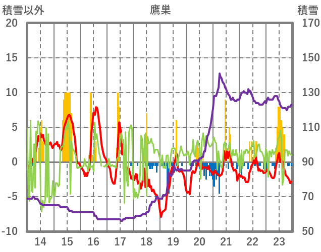 | 日 | 時 | 気温 | 降水 | 風向/風速 | 日照 | 積雪 | 降雪 |