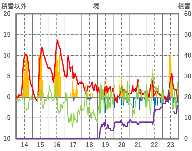 | 日 | 時 | 気温 | 降水 | 風向/風速 | 日照 | 積雪 | 降雪 |