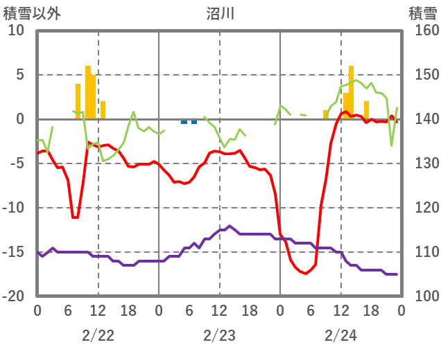 | 日 | 時 | 気温 | 降水 | 風向/風速 | 日照 | 積雪 | 降雪 |