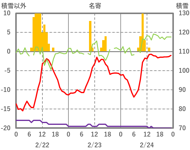 | 日 | 時 | 気温 | 降水 | 風向/風速 | 日照 | 積雪 | 降雪 |