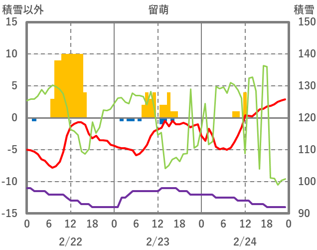 | 日 | 時 | 気温 | 降水 | 風向/風速 | 日照 | 積雪 | 降雪 |