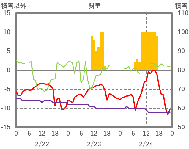 | 日 | 時 | 気温 | 降水 | 風向/風速 | 日照 | 積雪 | 降雪 |
