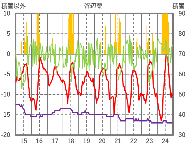 | 日 | 時 | 気温 | 降水 | 風向/風速 | 日照 | 積雪 | 降雪 |