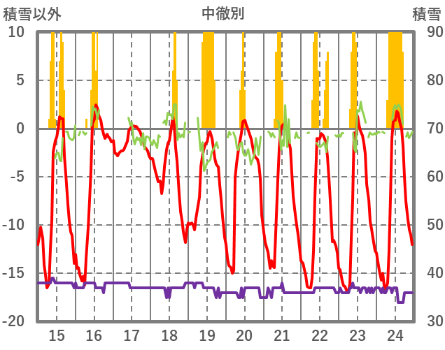 | 日 | 時 | 気温 | 降水 | 風向/風速 | 日照 | 積雪 | 降雪 |