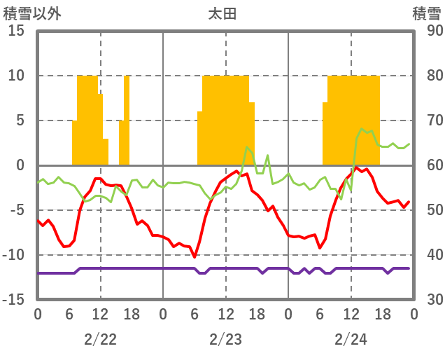 | 日 | 時 | 気温 | 降水 | 風向/風速 | 日照 | 積雪 | 降雪 |