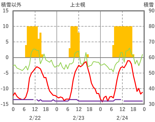 | 日 | 時 | 気温 | 降水 | 風向/風速 | 日照 | 積雪 | 降雪 |
