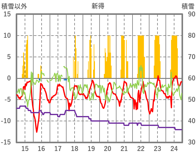 | 日 | 時 | 気温 | 降水 | 風向/風速 | 日照 | 積雪 | 降雪 |