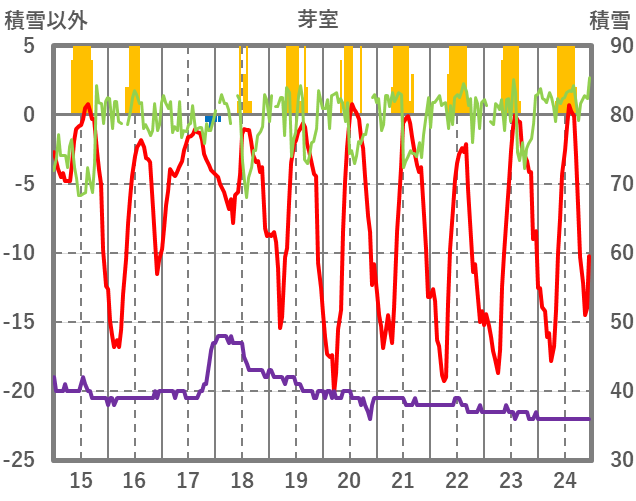 | 日 | 時 | 気温 | 降水 | 風向/風速 | 日照 | 積雪 | 降雪 |