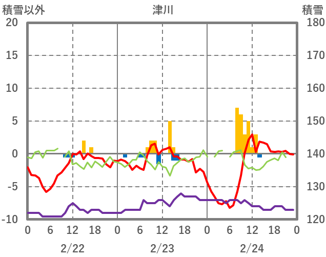 | 日 | 時 | 気温 | 降水 | 風向/風速 | 日照 | 積雪 | 降雪 |