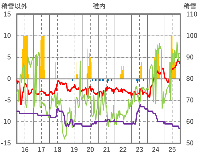 | 日 | 時 | 気温 | 降水 | 風向/風速 | 日照 | 積雪 | 降雪 |