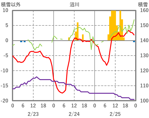 | 日 | 時 | 気温 | 降水 | 風向/風速 | 日照 | 積雪 | 降雪 |