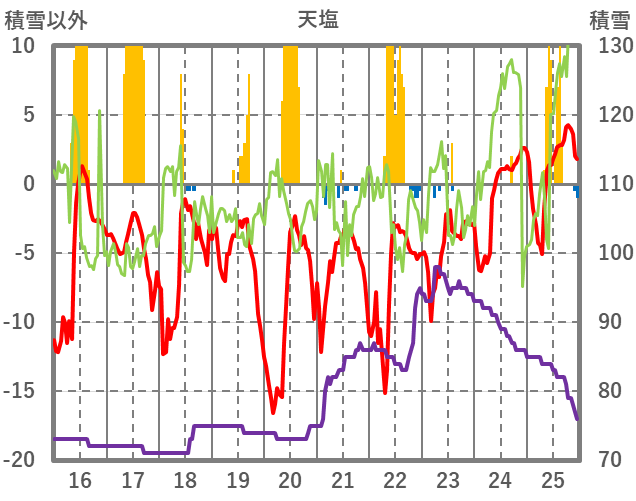 | 日 | 時 | 気温 | 降水 | 風向/風速 | 日照 | 積雪 | 降雪 |