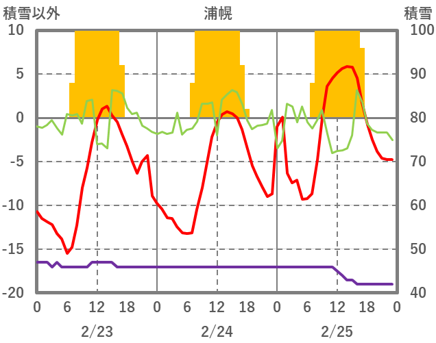 | 日 | 時 | 気温 | 降水 | 風向/風速 | 日照 | 積雪 | 降雪 |