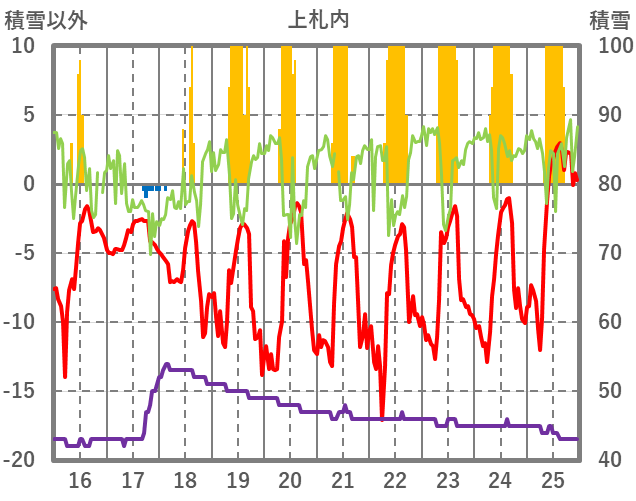 | 日 | 時 | 気温 | 降水 | 風向/風速 | 日照 | 積雪 | 降雪 |