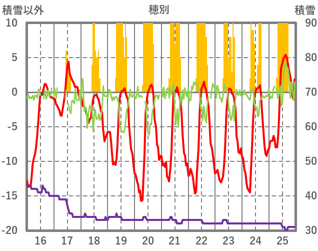 | 日 | 時 | 気温 | 降水 | 風向/風速 | 日照 | 積雪 | 降雪 |