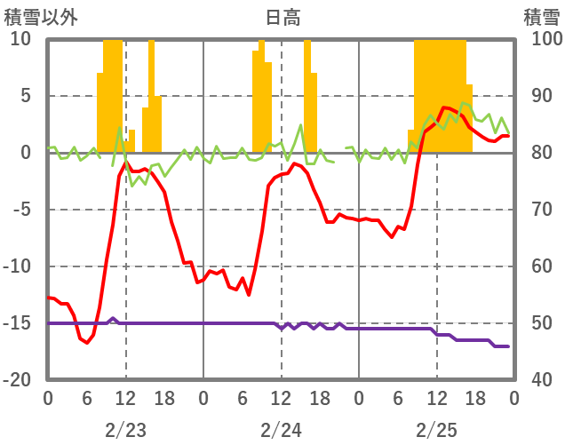| 日 | 時 | 気温 | 降水 | 風向/風速 | 日照 | 積雪 | 降雪 |